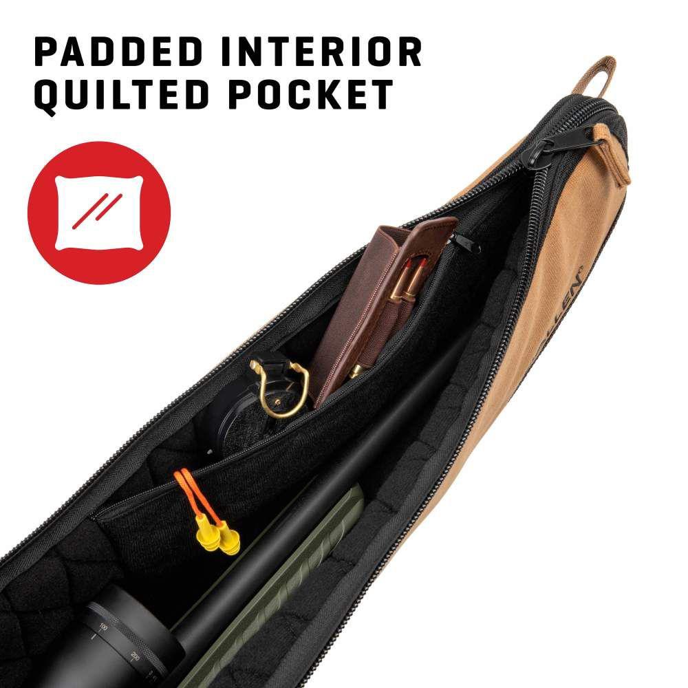 • AMPLE STORAGE: Features 1 large exterior zippered pocked & 1 interior quilted pocket to store extra ammo hearing protection or other shooting essentials.