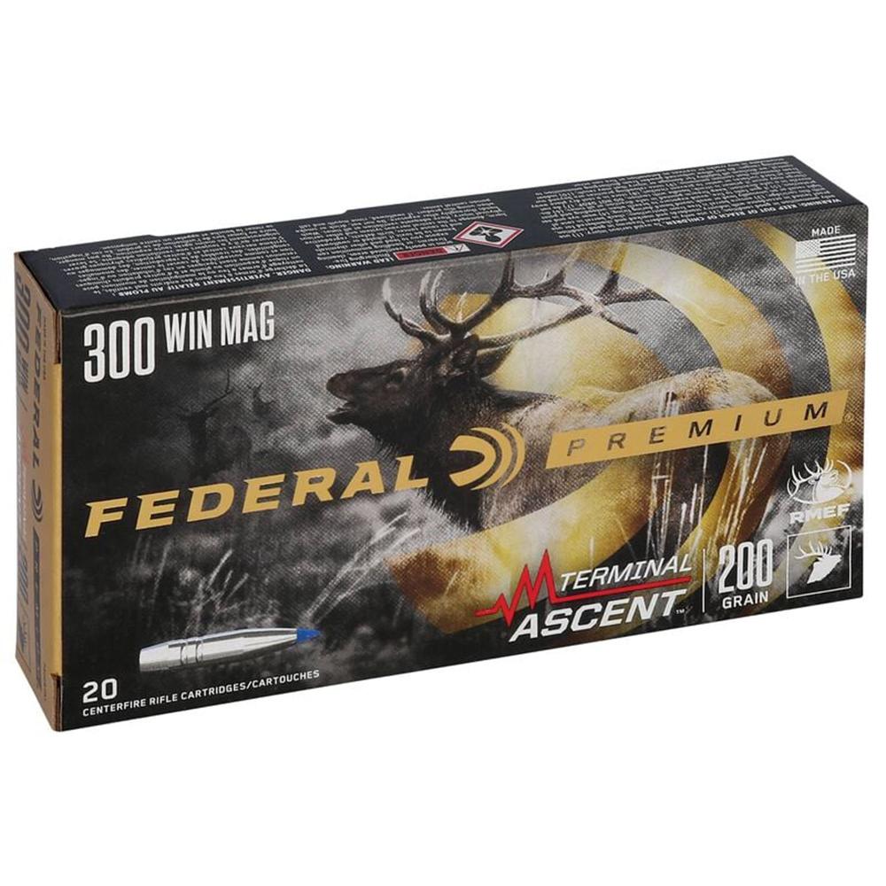 Any hunt. Any range. Experience the unmatched performance of the Federal Terminal Ascent 300 Win Mag ammo. Go beyond what you ever thought possible with Federal Premium Terminal Ascent. Bonded construction penetrates deep on close targets while the patented Slipstream polymer tip initiates expansion at velocities 200 fps lower than comparable designs. Specifically tailored for the 300 Win Mag Terminal Ascent ammo the bullet's long sleek profile offers an extremely high ballistic coefficient and its AccuChannel™ groove technology improves accuracy and minimizes drag. Available in a full selection of long-range hunting cartridges.