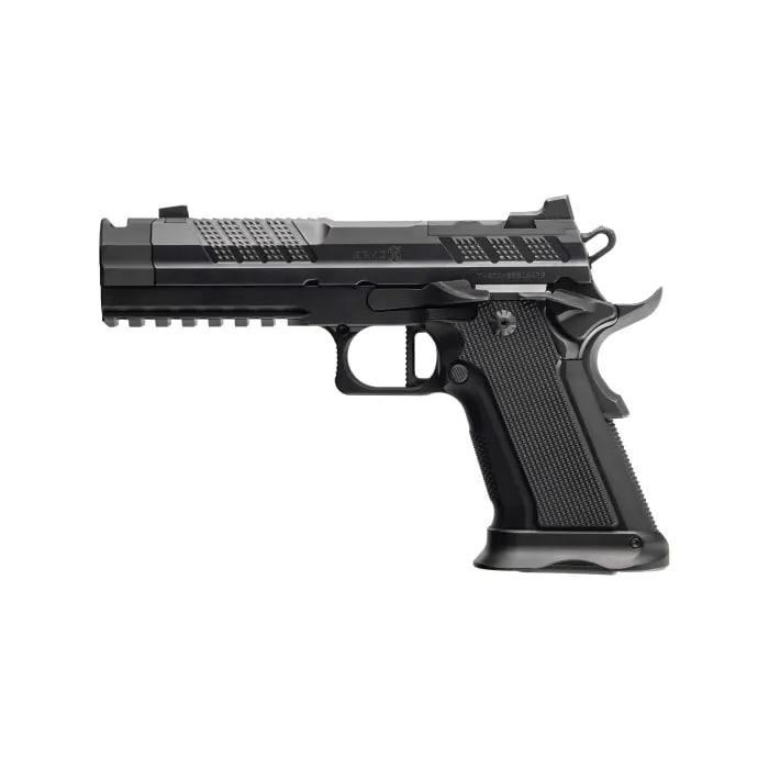 Features:Platform: 1911-based double stackCaliber: 9MMMagazine Compatibility: Glock® 17 magazinesConstruction: All bar stock materials precision CNC machinedMagazine Catch: Checkered PolycarbonateSlide: 4.6″ with integrated comp pro cocking serrations and aggressive forward cutsSights: Novak compatible front and rear combat sights Rear sight mounted on a removable plate for RMR red dot sights RMR plate included for RMR/SRO red…