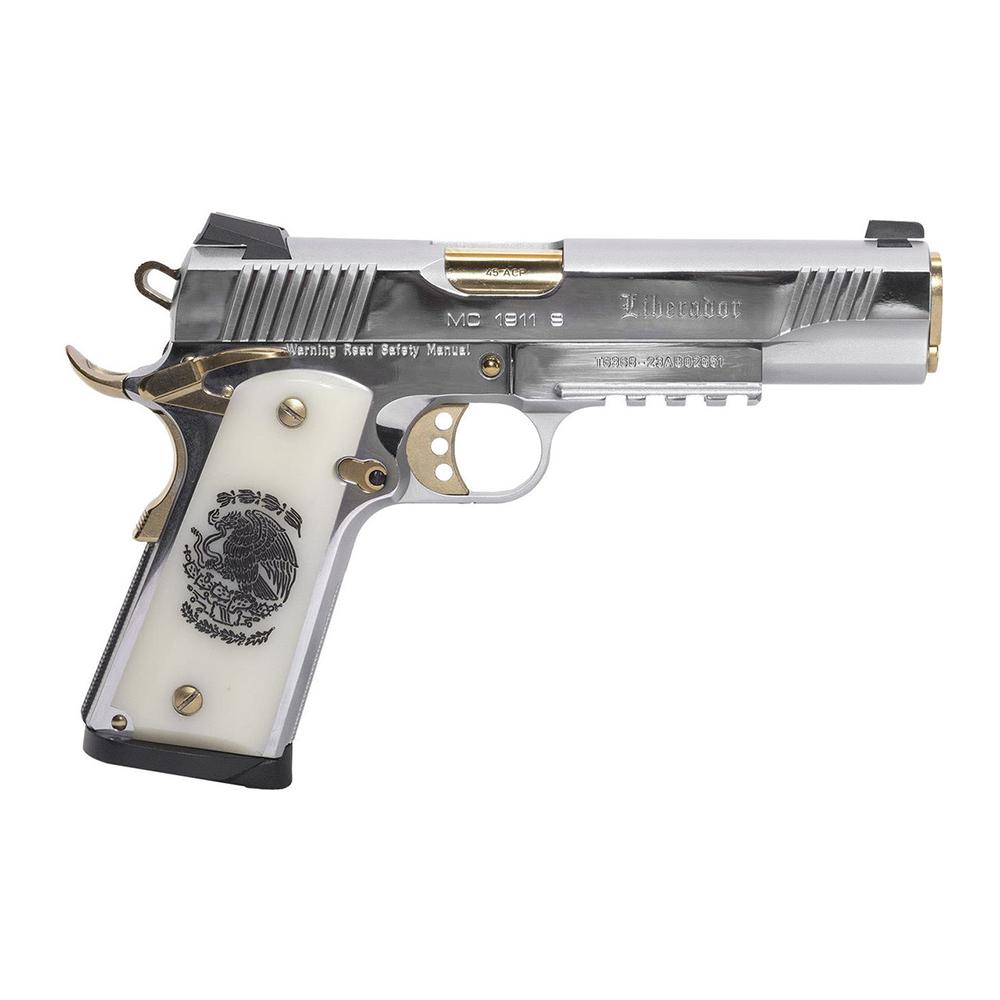 The EUROPEAN AMERICAN ARMORY Girsan MC1911 Liberador II Pistol features a polished stainless-steel slide and frame matched with polished gold controls and engraved grips adding an element of cultural significance to this beautiful pistol chambered in 9mm (Government 5") with an adjustable rear sight.