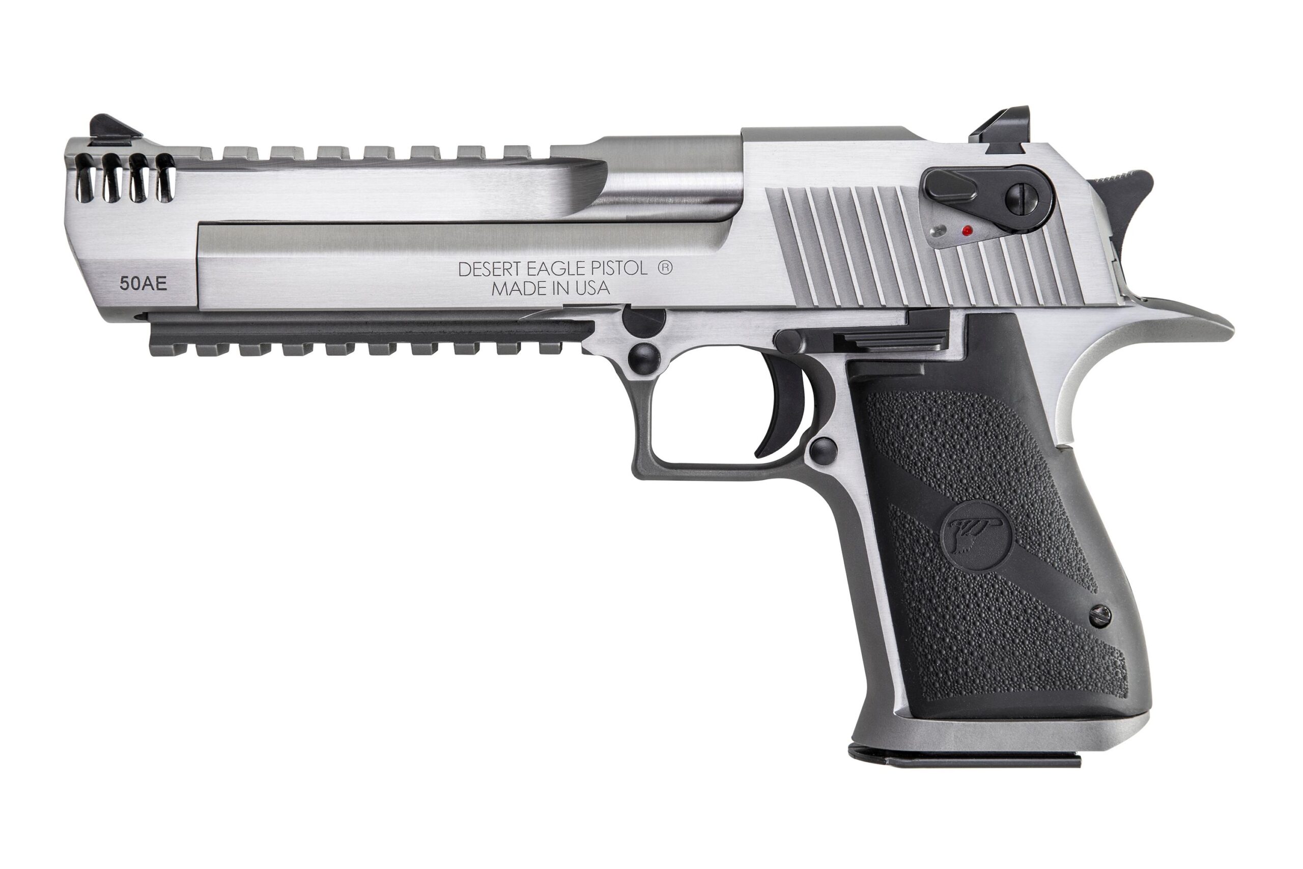 The Desert Eagle all stainless steel model is offered in a 6” with an integral muzzle brake. The integral muzzle brake offers significant recoil reduction less muzzle flip and a new streamlined look. Desert Eagle Mark XIX Pistol .50 AE Stainless Steel with Picatinny Bottom Rail Weaver Style Top Rail Integral Muzzle Brake Black Appointments. 6" barrel 7 round magazine