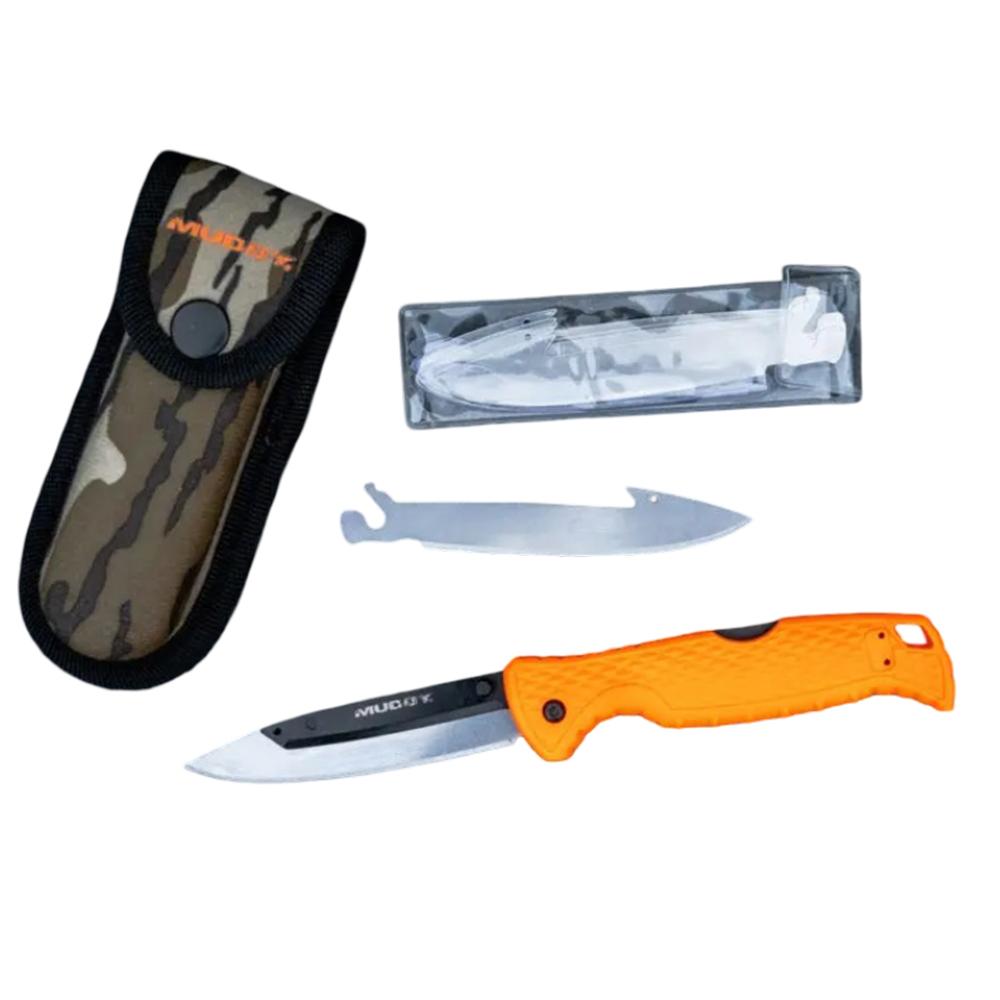 Muddy Swap Replace-A-Blade Folding Knife 3-1/2″ Drop Point Blade Orange with 5 Blades and Pouch