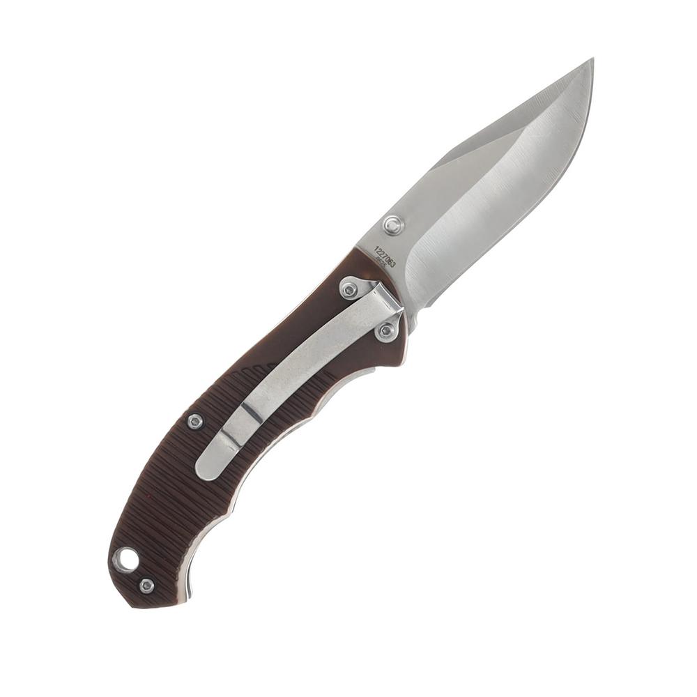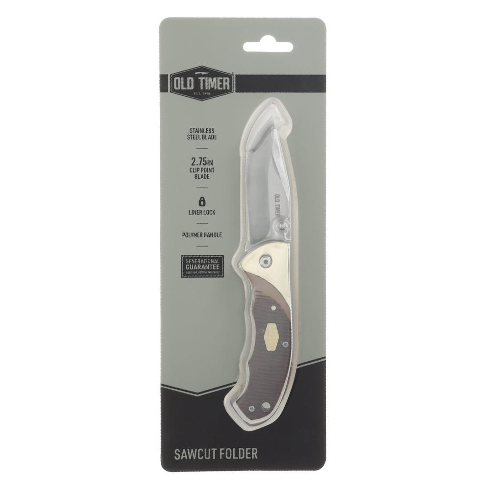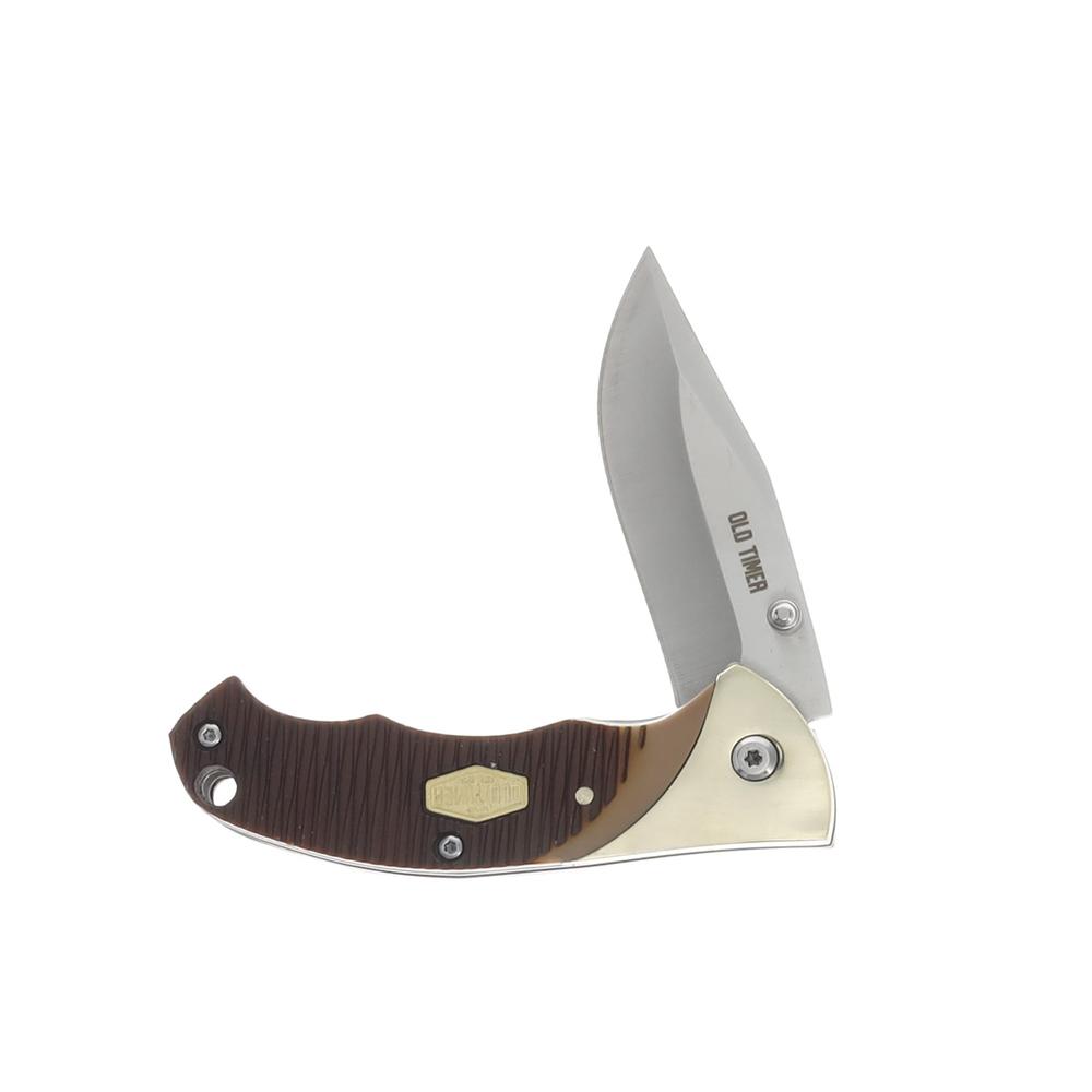 The Old Timer Folding Knife with a 2.75-inch clip point stainless steel blade and brown polymer handle is built for those who value reliability functionality and classic design in a compact package.