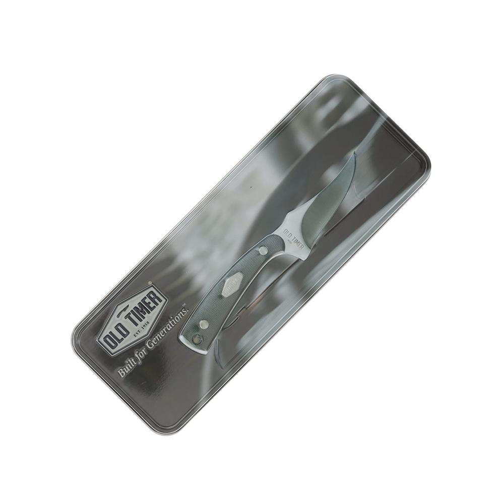 This knife set comes packaged in a collectible clam pack tin perfectly presenting both knives in a striking display. The Sharpfinger fixed blade rests atop a stack of light brown work gloves with the polyester sheath centered in the middle and a chain dangling to the right creating an authentic rugged presentation. The Old Timer logo and their “Built for Generations” motto are displayed on the left reinforcing the heritage and craftsmanship associated with the brand. The tin itself enhances the set’s appeal as a gift or collectible while keeping both knives secure and ready for use.