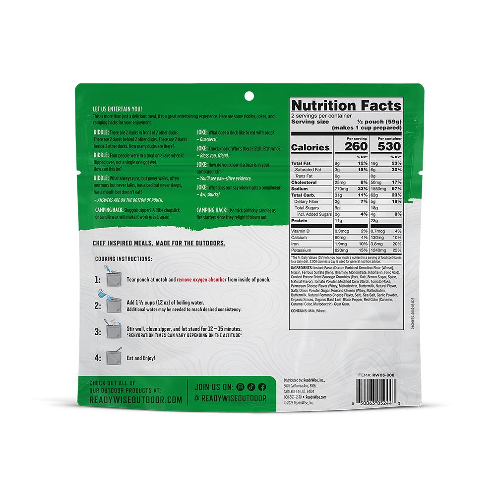 Each pouch of Lasagna with Sausage contains 2.5 servings and is resealable. These pouches are lightweight making the easily portable for any outdoor adventure. Just add water and you can eat directly from the pouch.