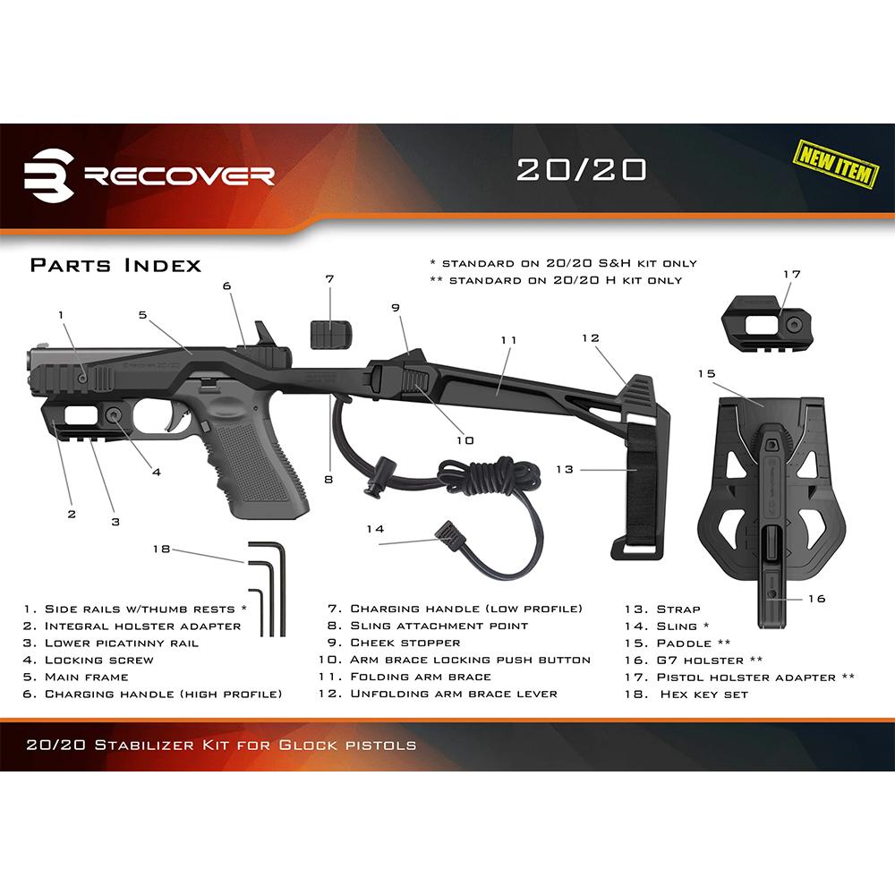 Enhance the stability and performance of your Glock with the Recover Tactical 20/20N Pistol Brace Stabilizer Kit. This innovative kit is compatible with all 9mm and .357 Double Stack Gen 1-5 Glock pistols including popular models like the Glock 26 and Glock 27 as well as all Double Stack Gen 1-4 SW40 Glocks. Designed for easy installation the kit provides improved accuracy and control without the need for NFA registration when you select the TFA Kit version. Available in brace or stock options (with NFA rules applicable) this high-quality stabilizer kit is perfect for shooters looking to get the most out of their Glock. Rated 4.96 out of 5 stars it’s a proven favorite among Glock owners! Covered by US Patents US11306996B2 and US Patent 11592262