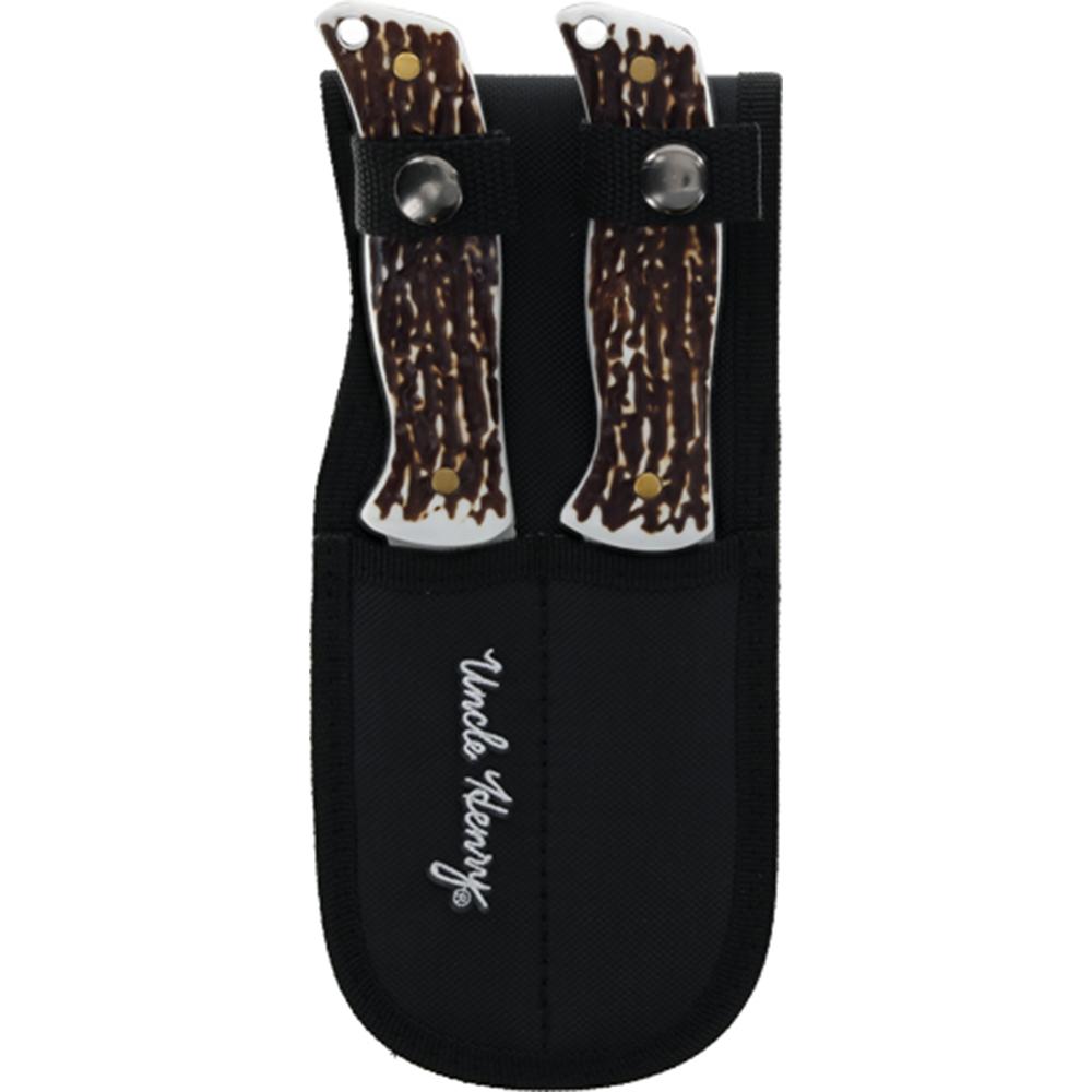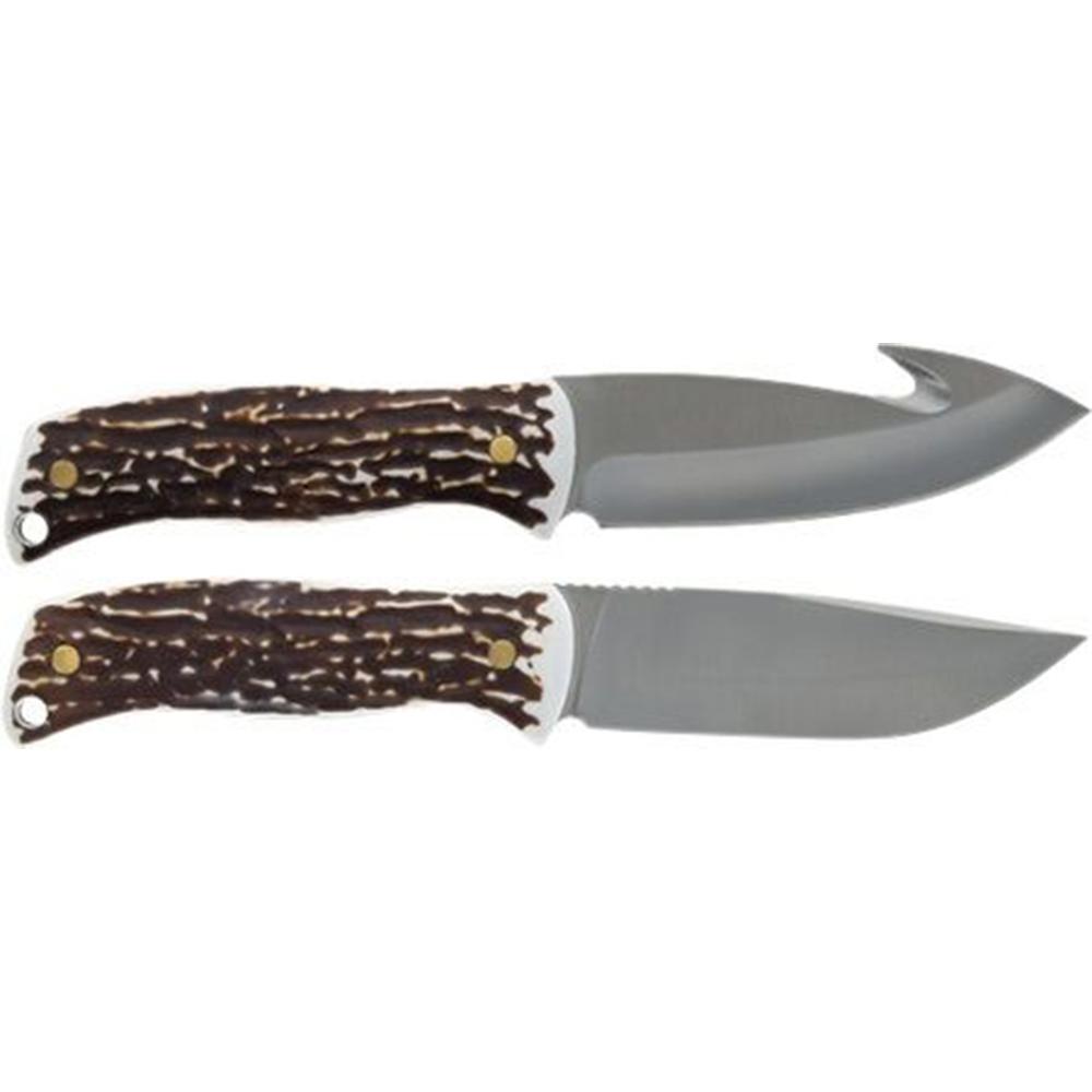 The Uncle Henry 2-Piece Fixed Blade Hunting Knife Combo delivers two classic dependable field knives designed for hunters who value durability control and traditional styling. Both the gut knife and caping knife feature 4.2" satin-finished stainless steel blades that hold an edge well and resist corrosion in demanding outdoor conditions. Each knife is fitted with a 4.6" Staglon handle in a rich brown finish offering a secure comfortable grip with the timeless look of traditional hunting knives.