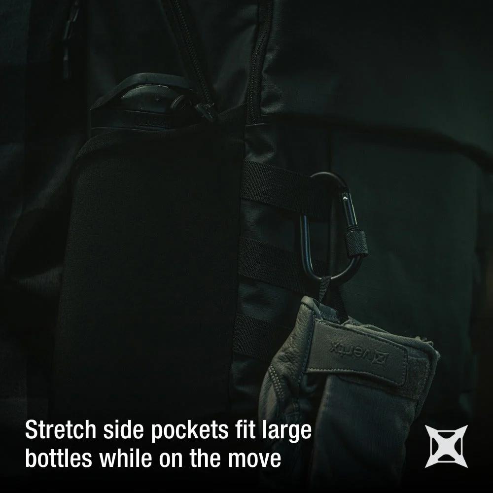 • Hydration on demand. Stretch side pockets fit large bottles while main compartment is compatible with hydration bladder.
